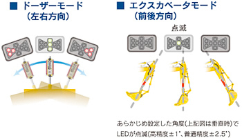 ブレードの左右傾き表示をするドーザーモードとアームの鉛直を表示するエクスカベータモードの2モードを装備しています。
